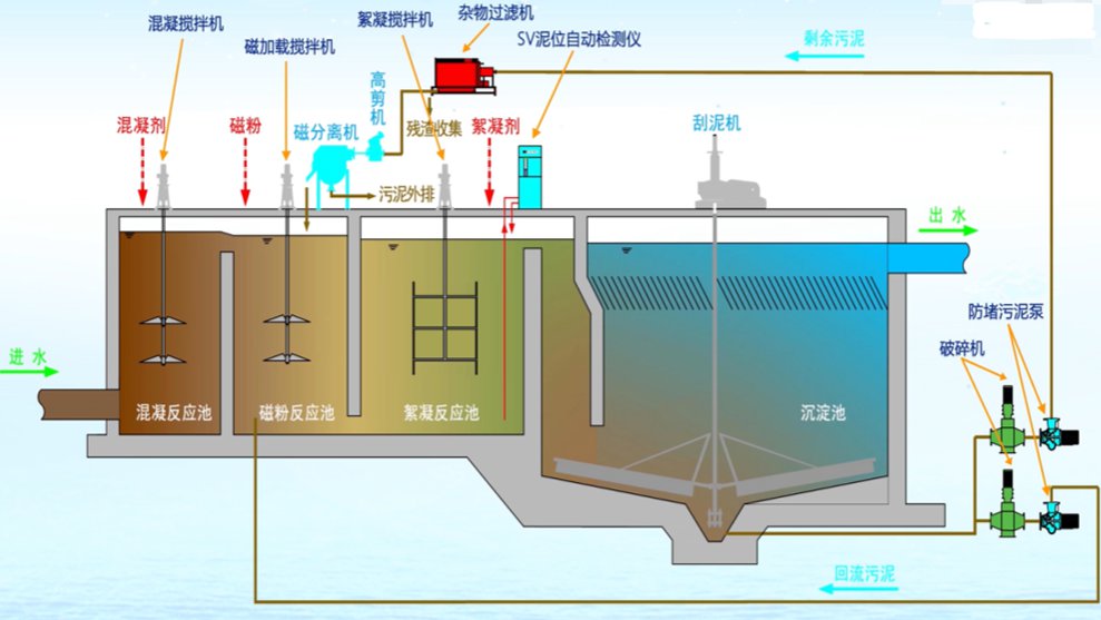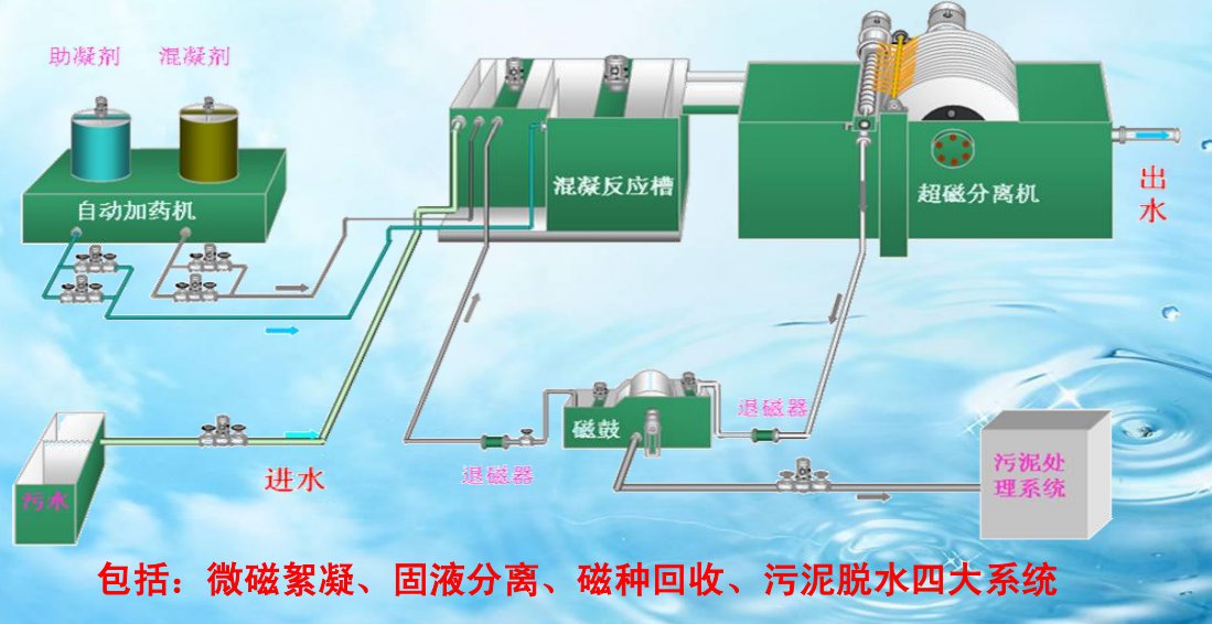 磁分離水體凈化技術是通過磁粉、混凝劑以及水中污染物質的微磁聚凝作用,將污染物質與磁粉凝聚成磁性絮體,再通過超磁分離設備產生的高強磁場,在強磁場力的作用下,使微絮凝體克服流體的阻力和自身的重力,產生快速的定向運動,吸附在磁盤的表面,通過設備的卸渣裝置實現泥渣與水體的分離,從而達到凈化水質的目的。磁性污泥再經磁粉回收設備,實現磁粉與污泥的分離;分離后的磁粉可以繼續回用,參與下一次的絮凝過程,達到循環利用。
